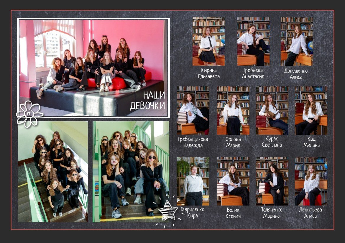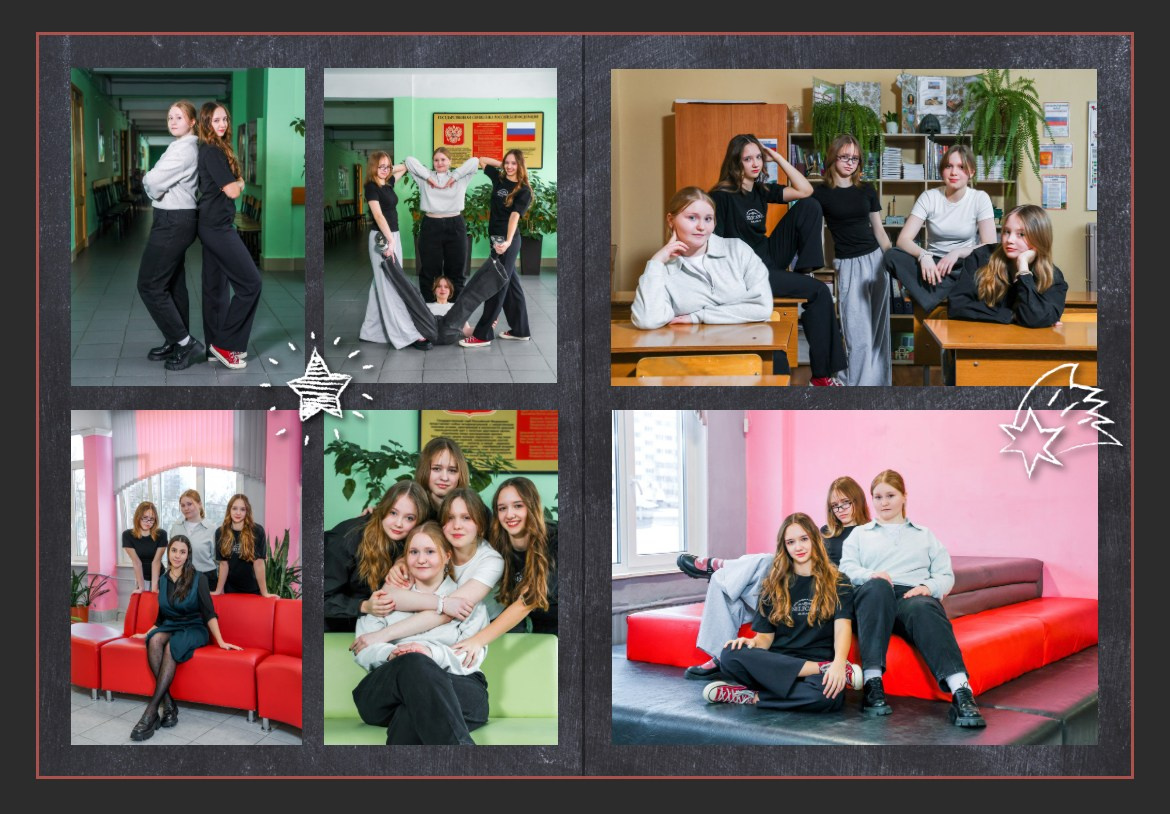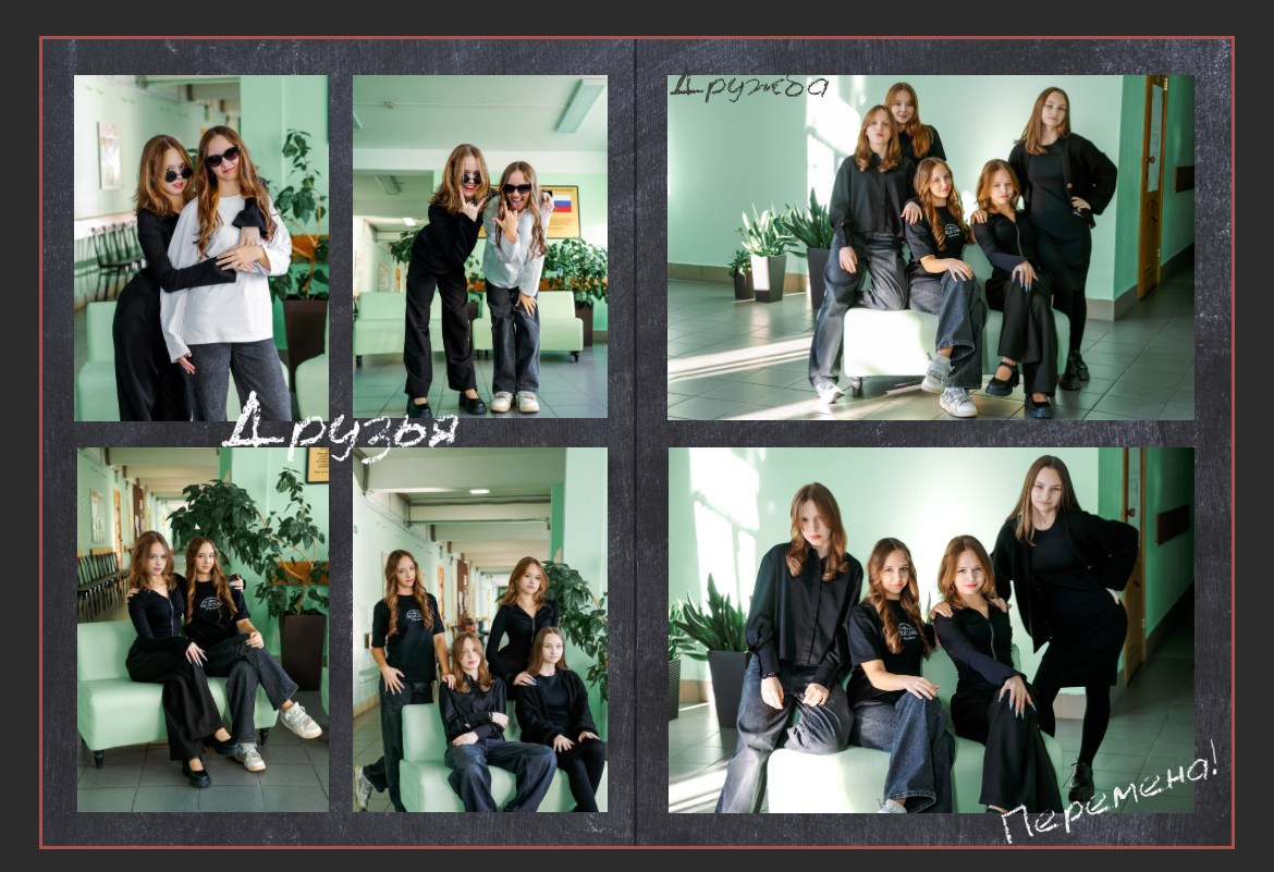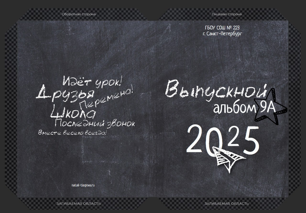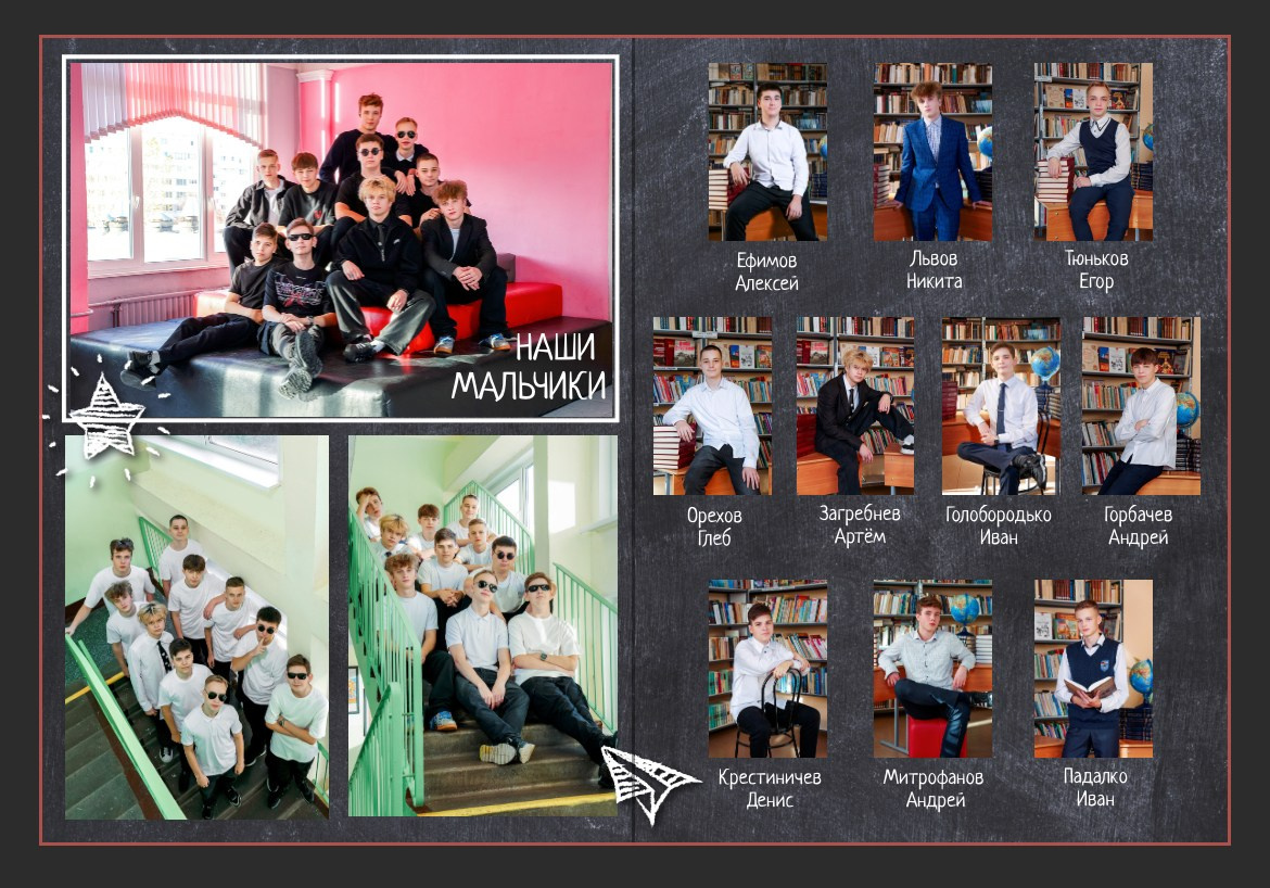 Дизайн альбома адаптирован как под мальчиков, так и под девочек. Есть вариант обложки — без фото. Структура альбома может обсуждаться. Развороты с виньетками — общие для всех альбомов в классе. Остальные фотографии — на ваш выбор. Количество разворотов может варьироваться.